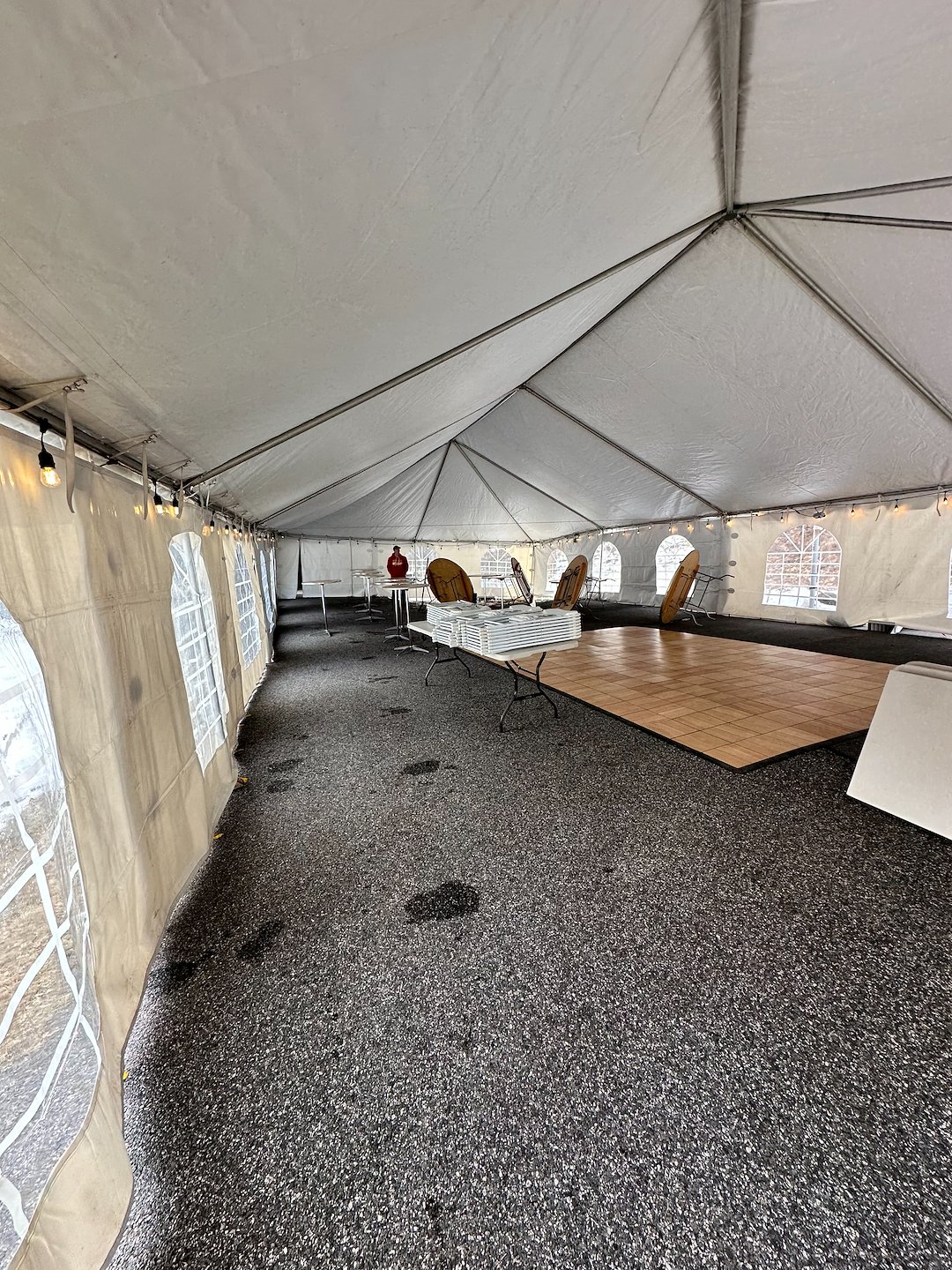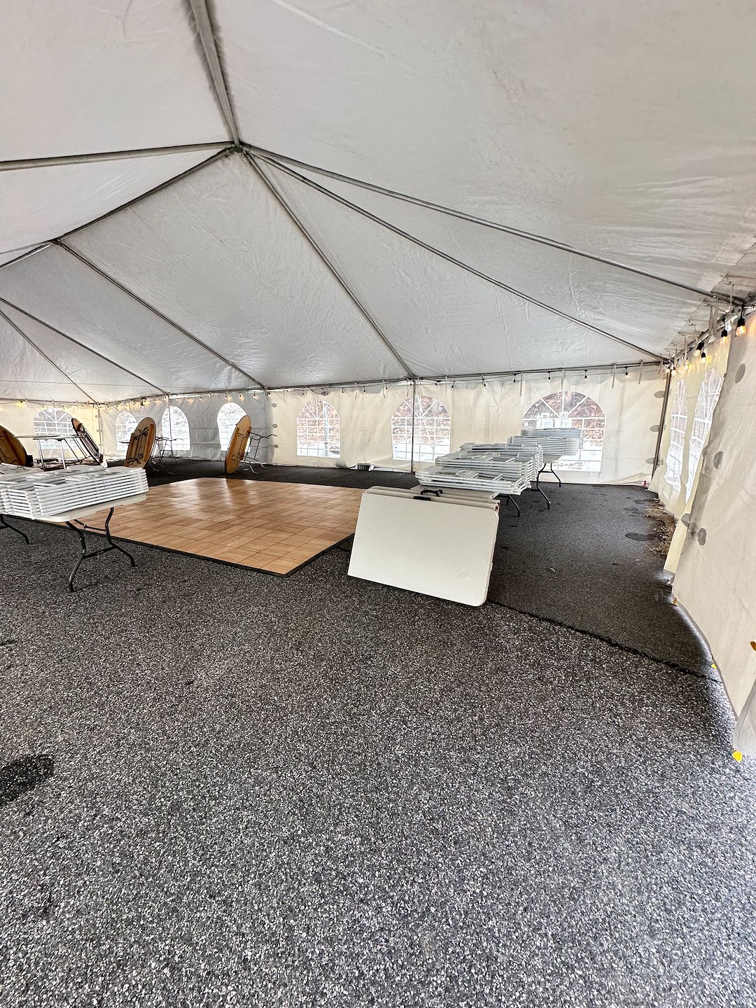⛺️ 30x60 white frame tent, maple dance floor, LED lighting, window side walls, 60” rounds, cocktail tables, banquet tables, and white folding chairs.