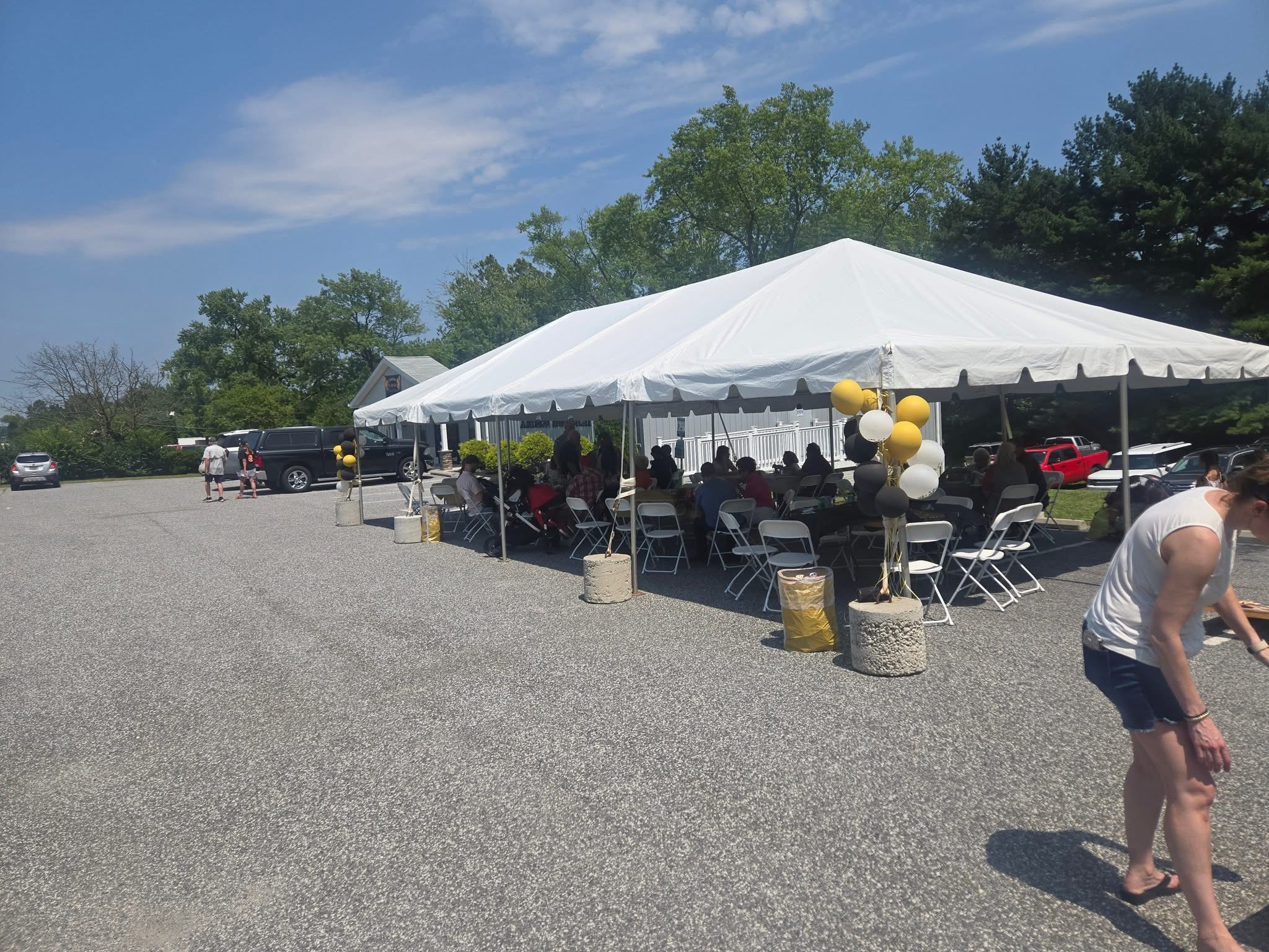 🏕️ 20x40 frame tent with concrete weights, 60” round tables, white folding chairs, large industrial drum fans set up in White Marsh, Maryland. Baltimore, Maryland tent rental company.